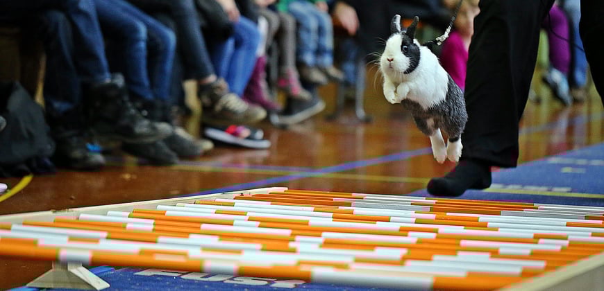 Über Hindernisse springen braucht viel Geduld und Zuwendung des Besitzers. Dem Kaninchen die Freude und auch das Selbstvertrauen zu übermitteln, es zu animieren und die natürlichen Fluchtinstinkte zu nehmen, ist wahrscheinlich die schwierigste Aufgabe überhaupt beim Kanin Hop.
